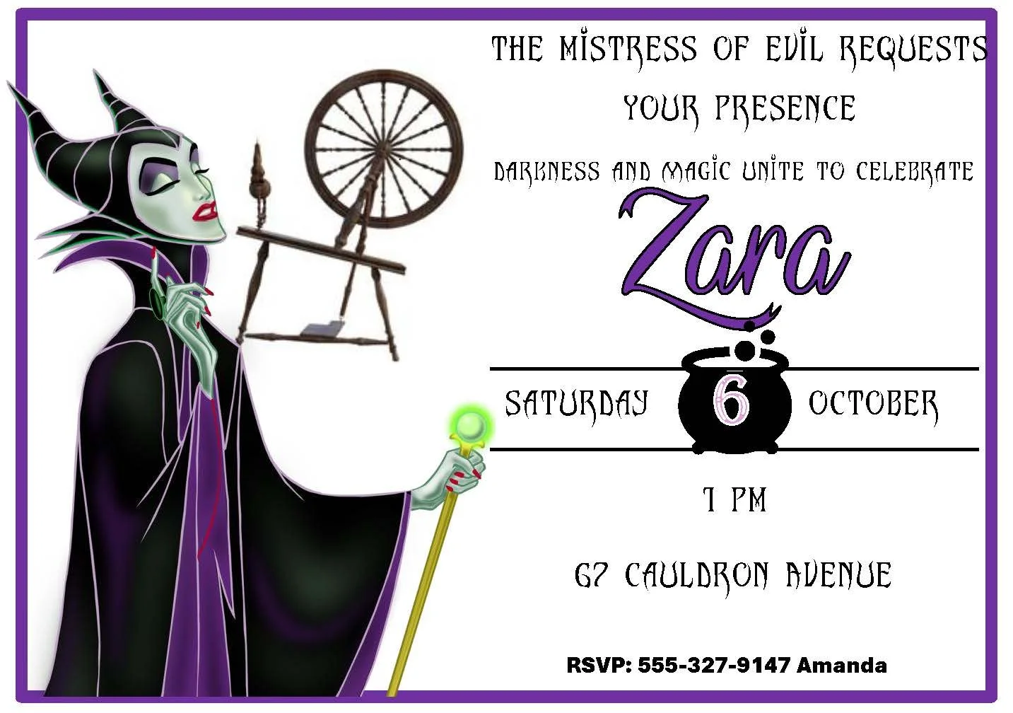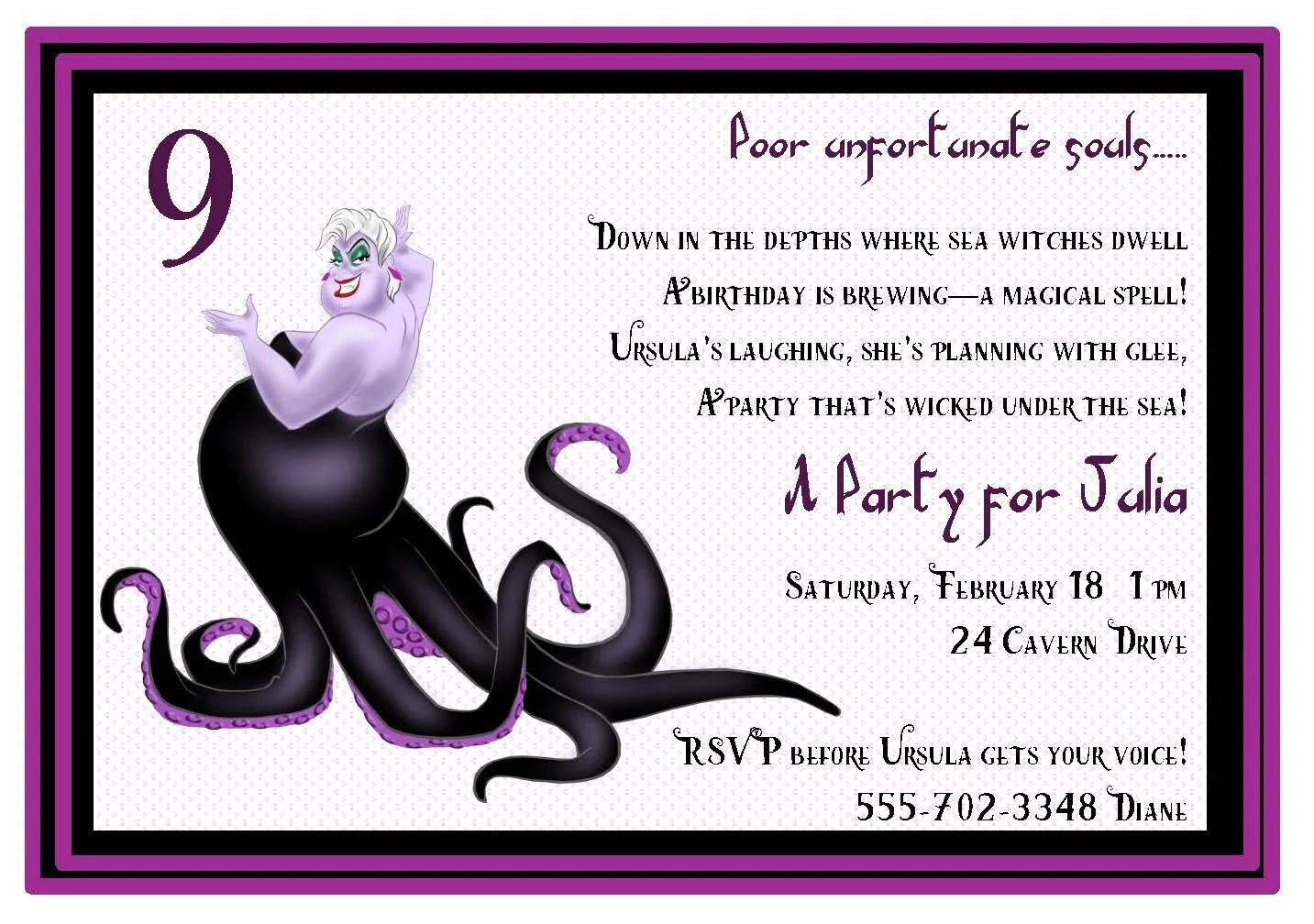 Dive into the deep with this Ursula invitation in wicked purple and black, , Ursula in her sea witch glory, and themed fonts that summon sea‑sorcery. Perfect for a villainous birthday or a spellbinding party, the design balances dramatic flair with playful charm—ready to set the tone for an unforgettable celebration.