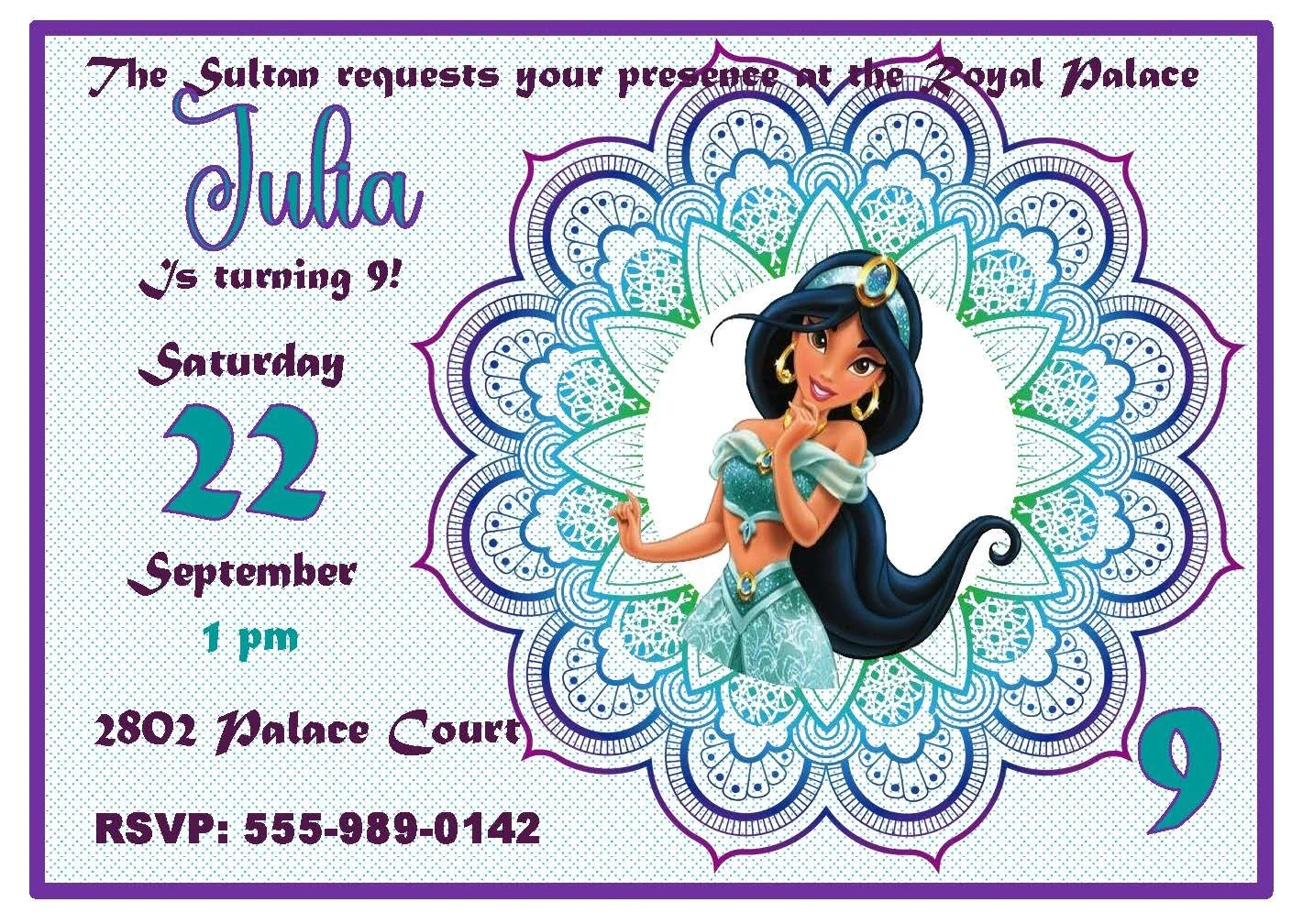 This colorful and pretty invitation features Jasmine against a purple and teal mandala background, complete with themed fonts and wording for an enchanting royal celebration. Perfect for a princess party, it adds instant sparkle and a cohesive look to your event. Lots of other styles available in our Disney Princess category to match any theme or color palette—mix and match for a magical party!
