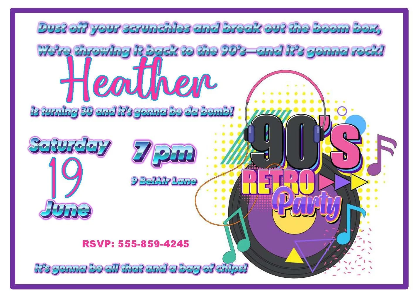 This pink, purple, and blue invitation captures the ’90s with bold color-blocking, playful symbols, and throwback fonts that scream retro-cool. Perfect for birthday parties, reunions, or any throwback celebration, it sets the tone before guests walk in the door. Browse our Decades collection for more nostalgic invitations and activity placemats inspired by the Roaring ’20s, the nostalgic ’50s, and the groovy ’70s—each design handmade with cheerful, party-ready flair.