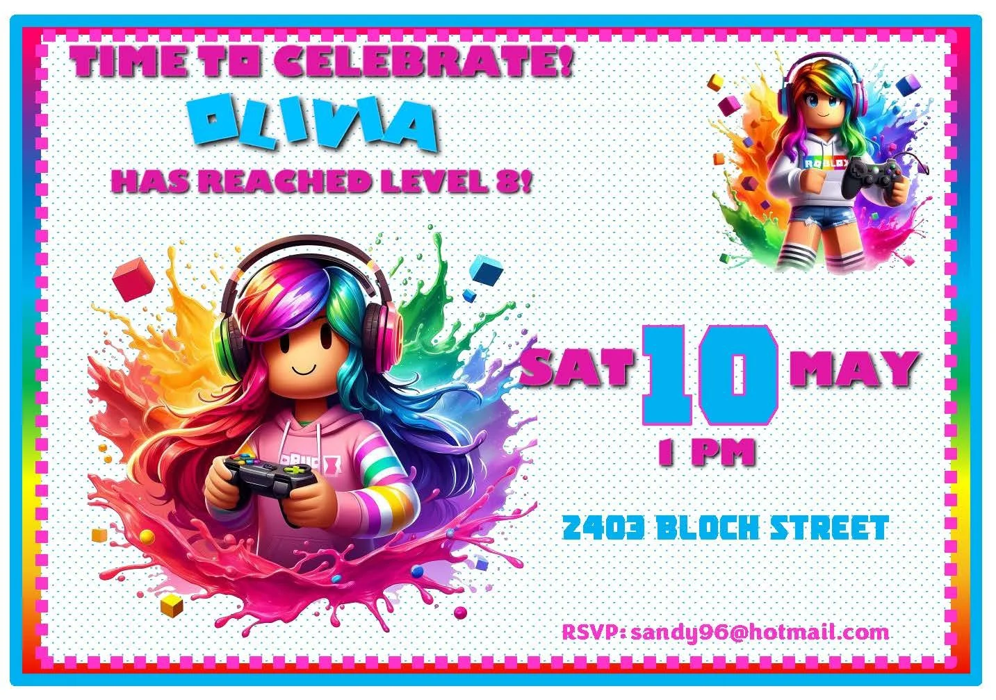 Grab your hoodie and headphones! This Roblox invitation in vibrant pink, purple, and blue is ready to level up your party. Designed for gamers and party-goers alike, it brings playful energy and colorful flair—perfect for birthdays, sleepovers, or game-night celebrations. Prefer more masculine colors? No problem! We offer several different styles and color themes to match any vibe, plus an optional custom activity placemat to keep guests entertained. Easy to personalize and packed with fun—your next party just hit max level.
