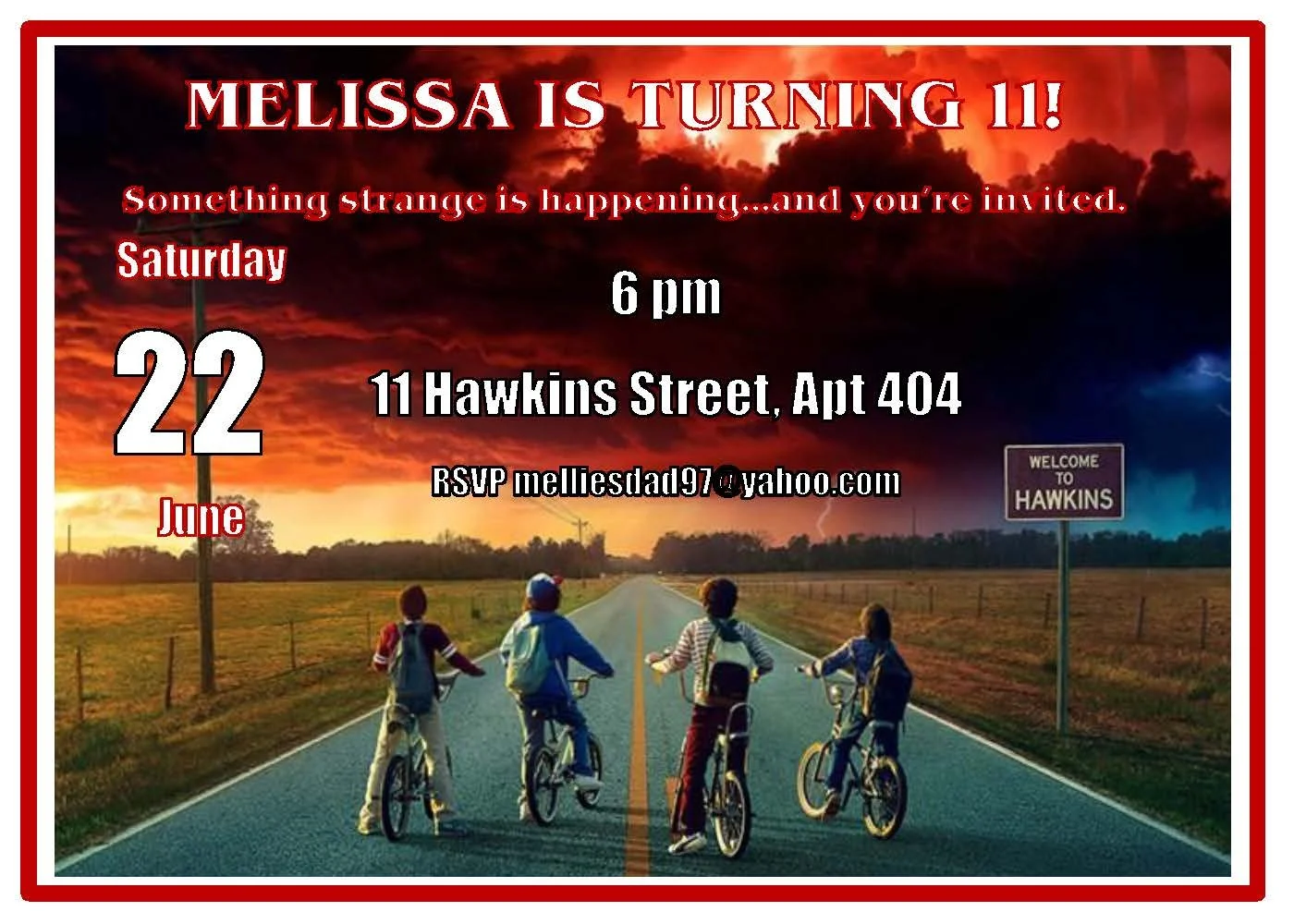 Our Stranger Things invitation features iconic scenes from the popular Netflix show, bringing spooky retro vibes straight to your inbox. Bold type, eerie color palettes, and familiar silhouettes set the mood for a '80s-inspired celebration—perfect for birthday parties, watch parties, or themed get-togethers. Customized with your event details, RSVP info, and a personal message. Check out our collection to complete the Upside Down experience.
