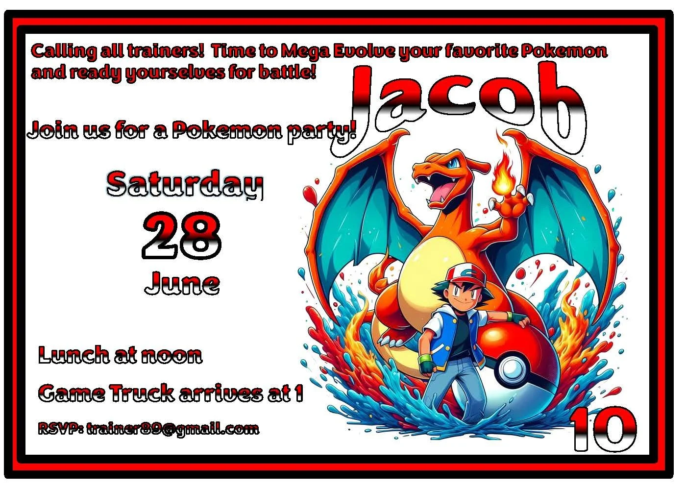 This cool Pokémon invitation will catch your guests’ attention with bold colors and a custom font that pops. Perfect for birthday parties and Pokémon-themed gatherings, it sets the tone for a fun, high-energy celebration. Don’t forget to explore our full collection of Pokémon invitations, custom activity placemats, and matching goodie bags to create a coordinated party that fans will love.