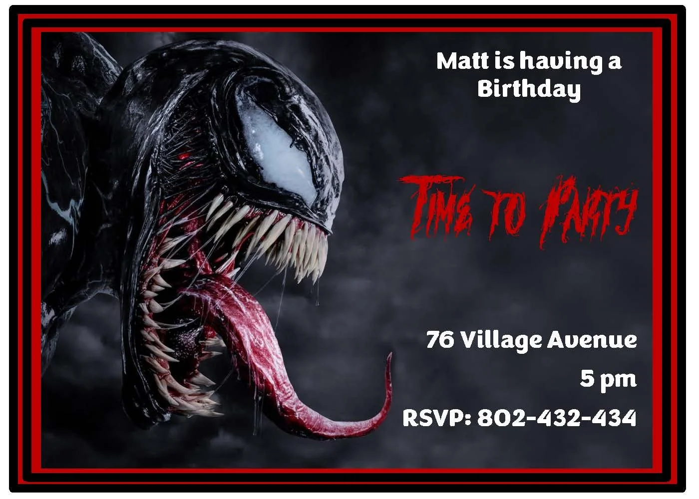 This Venom invitation in red and black is intense — bold, dramatic, and made to command attention. Deep crimson and jet-black collide with edgy typography and venom-inspired accents for a striking look that’s perfect for villain-themed parties, Halloween bashes, or any event where drama matters. Handmade with care, it arrives ready to wow your guests and set the mood from the moment it lands in their hands. Add matching envelopes or a custom RSVP detail to complete the fierce, unforgettable vibe.