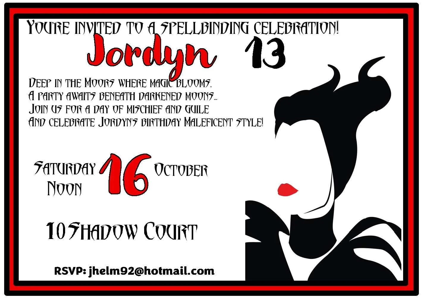This Maleficent invitation radiates dark enchantment with its bold black and red silhouette. Striking and dramatic, the design captures sinister elegance—perfect for a villain-themed party, Halloween bash, or any event that leans delightfully wicked. Thick matte cardstock and crisp contrast make every detail pop, setting the mood before guests even arrive. Invite them to an evening of mystery and mischief with a card that whispers, “Enter if you dare.”