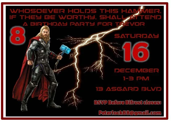 Our Thor collection boasts several invitation styles that capture the thunderous excitement of Asgardian adventures — from bold hammer motifs and lightning accents to rustic Norse textures. Each design is customizable with your child’s name, party details, and color choices to match any heroic theme. Don’t forget to check out our "Heroes and Villains" category for more heroic fun, and printable extras to make your celebration truly legendary.