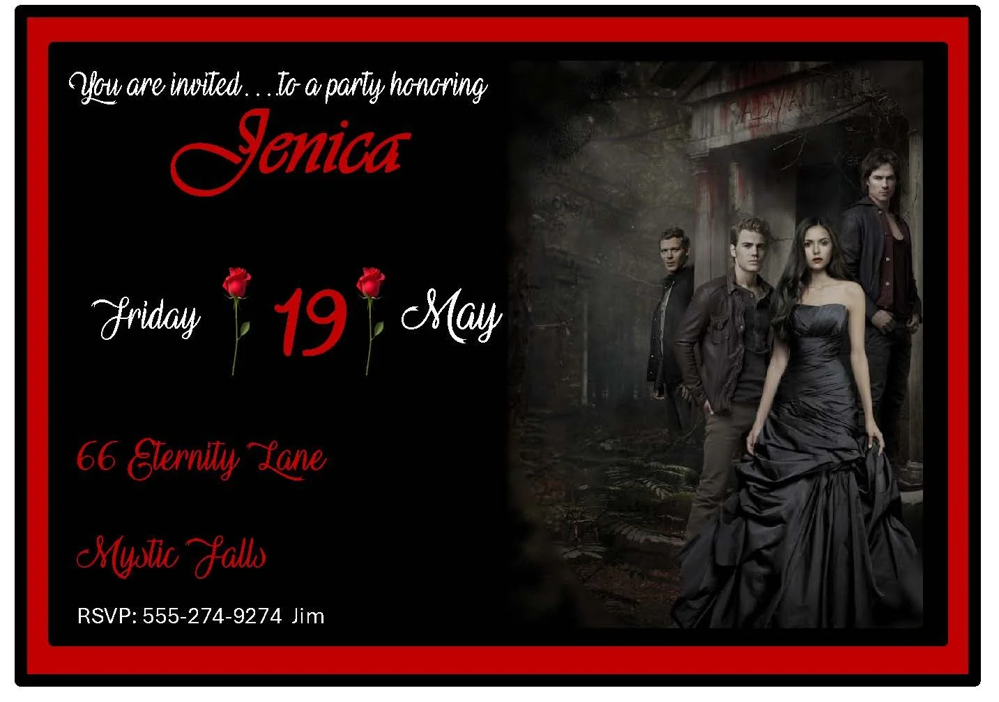 Sink your fangs into a chillingly stylish invite: deep blood-red script on a velvet-black background, and a whisper of moonlight. Perfect for Vampire Diaries–themed parties, this invitation teases dark romance and midnight secrets—think crimson roses, antique keys, and a promise of unforgettable nights. RSVP by candlelight and prepare for an evening of mystery, music, and immortal fun.