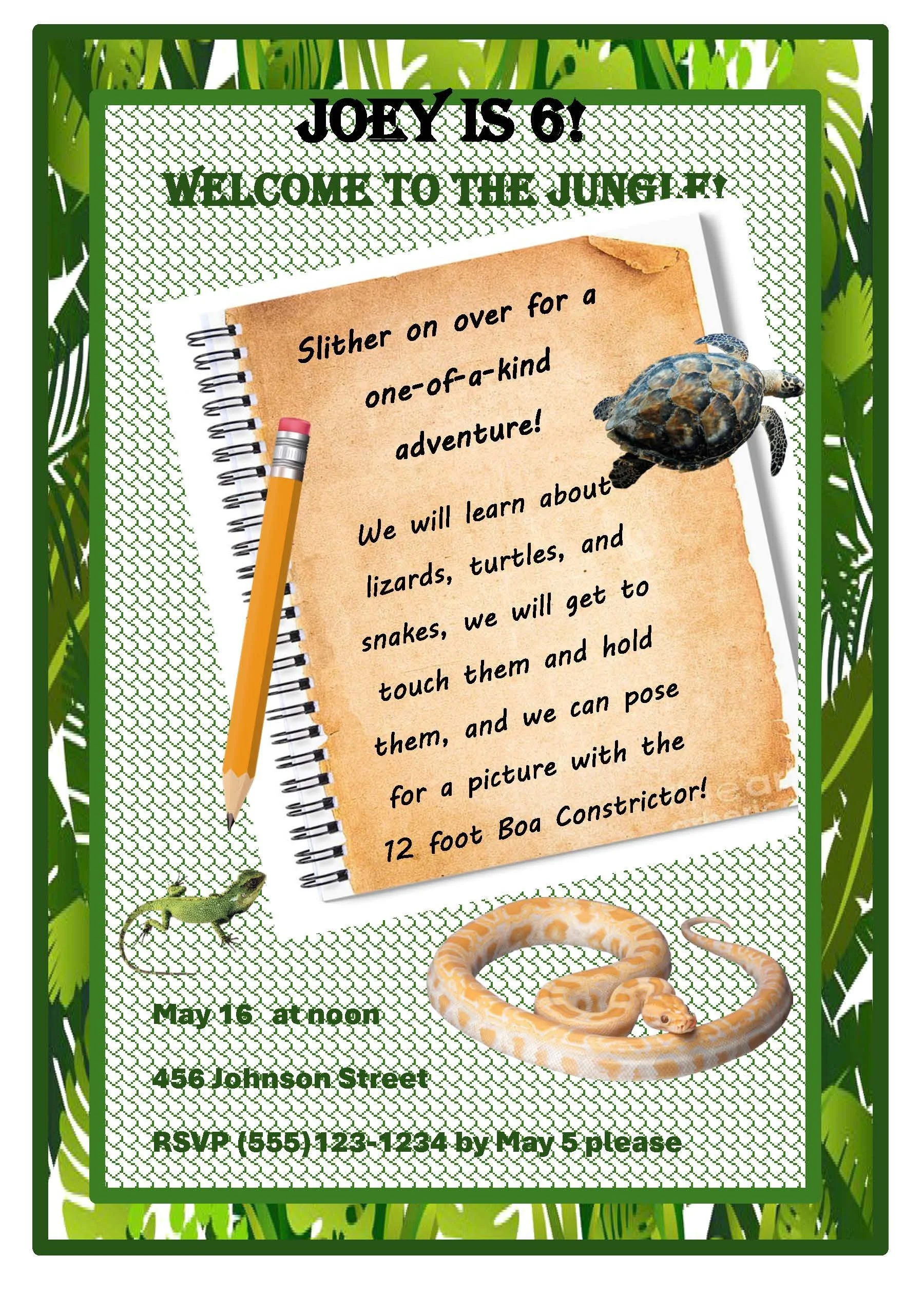 Invite your guests to become wildlife researchers for the day with this adventurous invitation! Featuring a notebook and pencil alongside a few curious animals set against a scaly background, this invite perfectly sets the tone for a safari or jungle-themed party. It’s the perfect way to spark excitement and curiosity as your little explorers prepare to embark on their wild expedition!