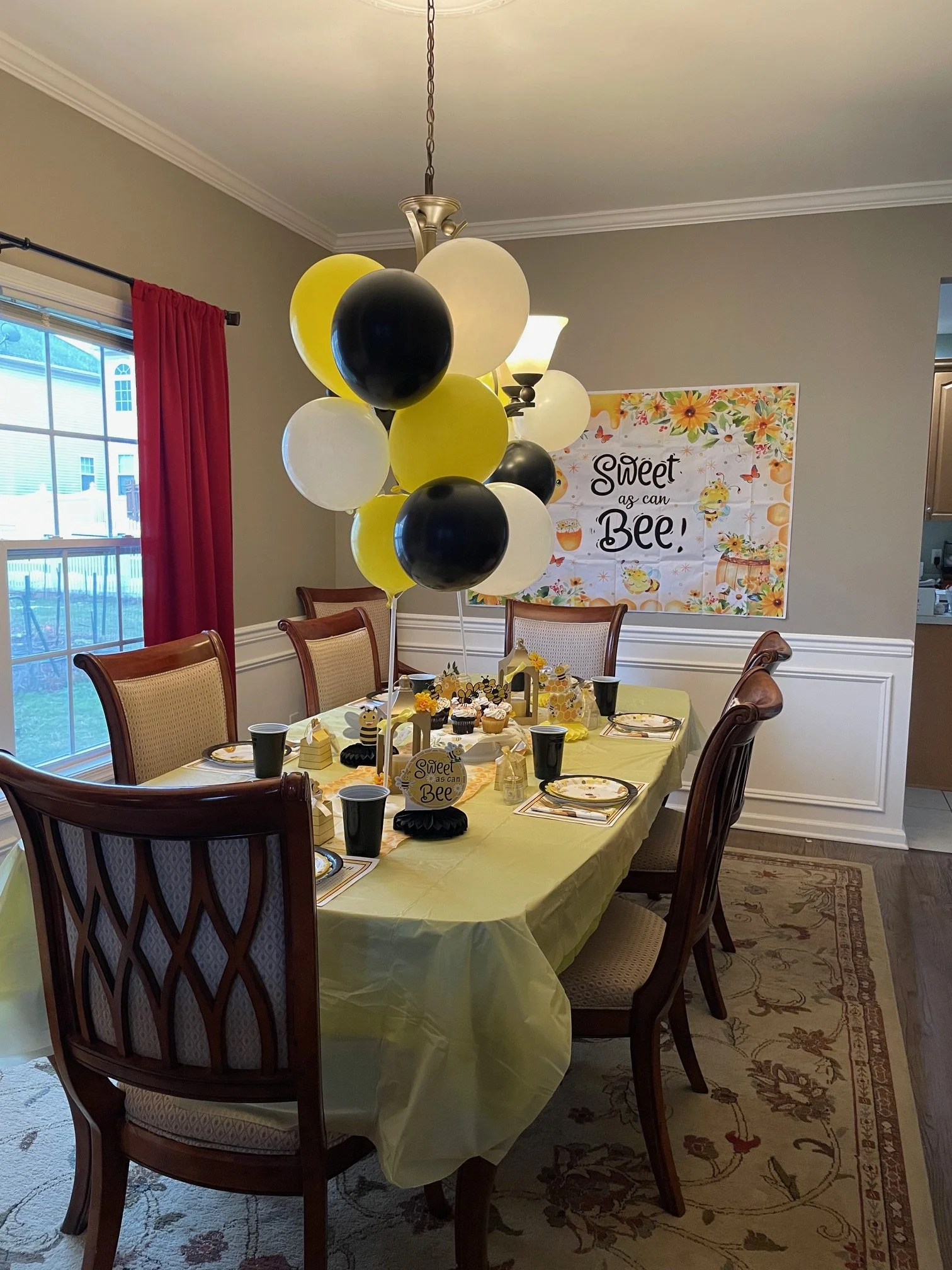 For a cohesive look, try a tablecover with a table runner in the center. Themed plates, napkins, and cups will pull the theme together. For an especially festive table, set each place with a custom activity placemat, a charger, and plate. For this table setting, I used small lanterns adorned with gold flowers and yellow bows. Simple honeycomb decorations are inexpensive and suit this table perfectly. A banner on the wall in the same theme and balloons in coordinating colors complete the festive look.