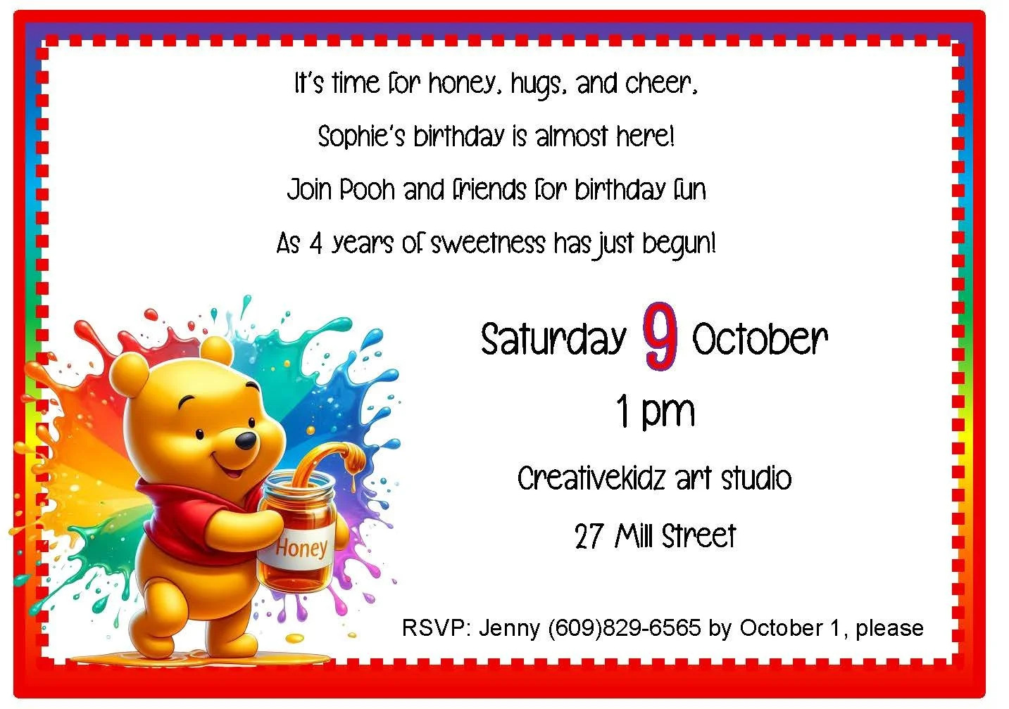 This bold, colorful invitation is playful and inviting—perfect for a cheerful celebration. Featuring a bright, rainbow-toned Winnie the Pooh, the design mixes nostalgic charm with modern, kid-friendly pops of color. Fun typography and lively accents make the invite feel warm and energetic, setting the tone for a joyful party filled with smiles, giggles, and sweet memories. Ideal for birthdays, baby showers, or any whimsical gathering where imagination leads the way.