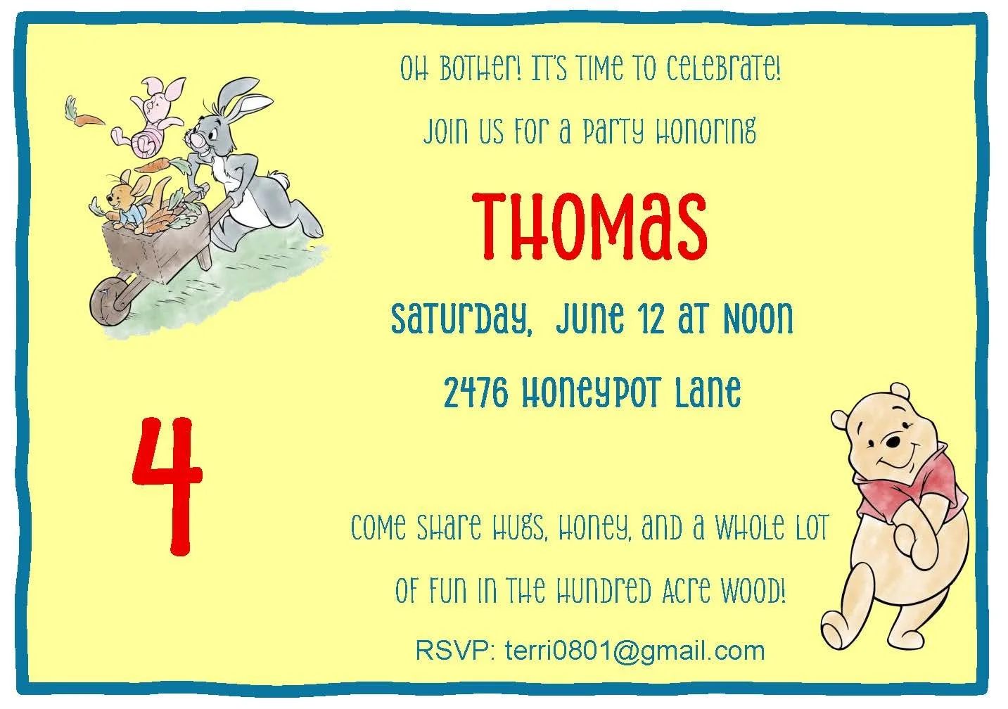 This whimsical invitation in cheerful blue, sunny yellow, and playful red features Winnie the Pooh and his adorable friends, inviting guests to a cozy celebration full of honeyed smiles and warm hugs. Sweet illustrations capture Pooh’s gentle charm alongside Piglet, Tigger, and friends in a delightful scene that feels like a stroll through the Hundred Acre Wood. Perfect for birthdays, baby showers, or any gathering where nostalgia and joy take center stage, this invitation sets a friendly, storybook tone that promises laughter, comfort, and magical memories.