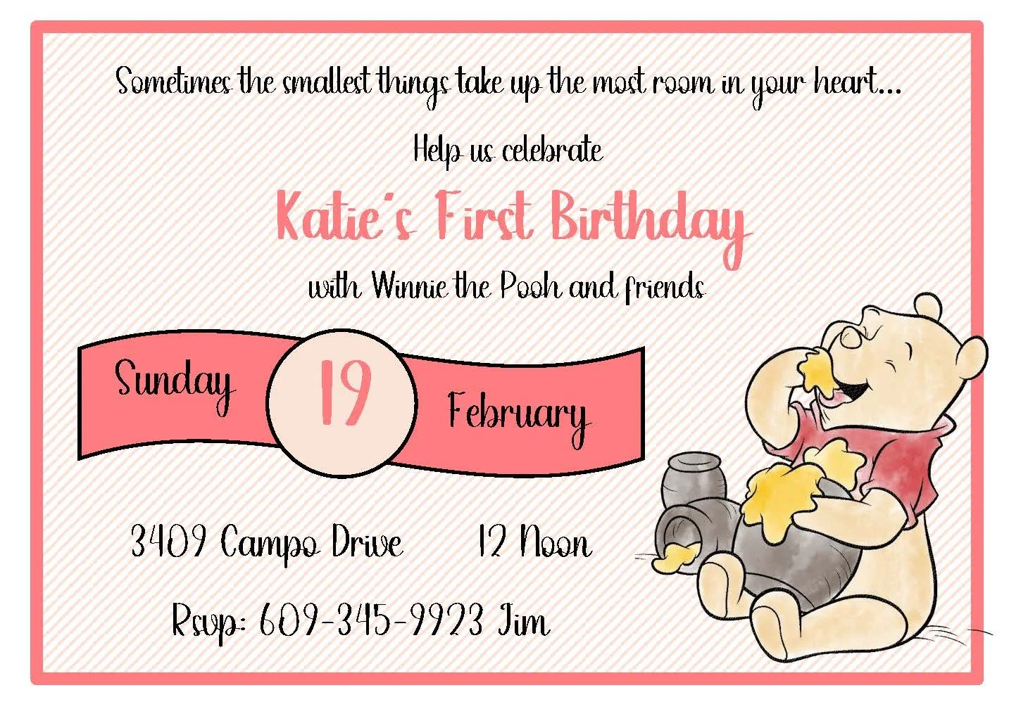 This sweet Winnie the Pooh invitation features Pooh happily enjoying a pot of honey against a soft pink background. Warm, whimsical artwork and gentle colors make it perfect for baby showers, first birthdays, or any celebration with a cozy, storybook feel. Printed on high-quality cardstock and personalized with your details—simple, charming, and sure to delight guests of all ages.